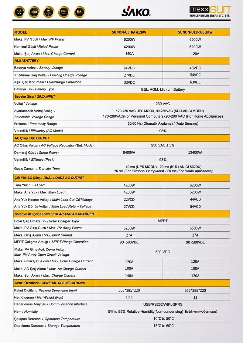 “SAKO Ultra 4.2kW 24V tam sinüs MPPT inverter — 6.2kW PV, MPPT 90–500V, 120A solar & 100A AC (140A toplam) şarj, 12–20ms geçiş; konut ve ticari kullanım için.”